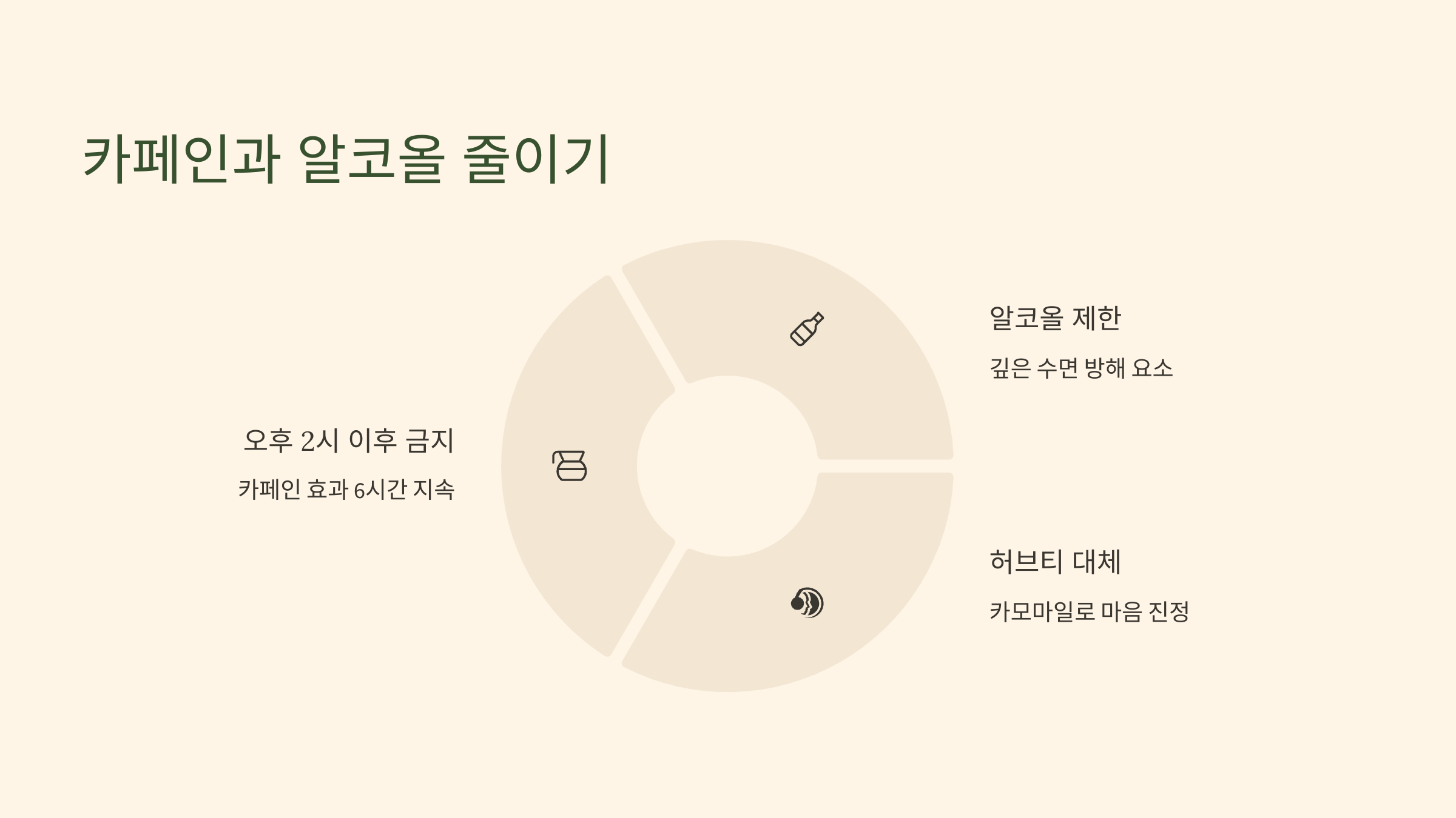 카페인은 섭취 후 6시간까지 효과가 지속되기 때문에, 오후 2시 이후에는 마시지 않는 게 좋습니다. 알코올도 마찬가지에요. 처음에는 졸리게 만들지만, 새벽에 깊은 잠을 방해해서 결국 더 피곤해진답니다.