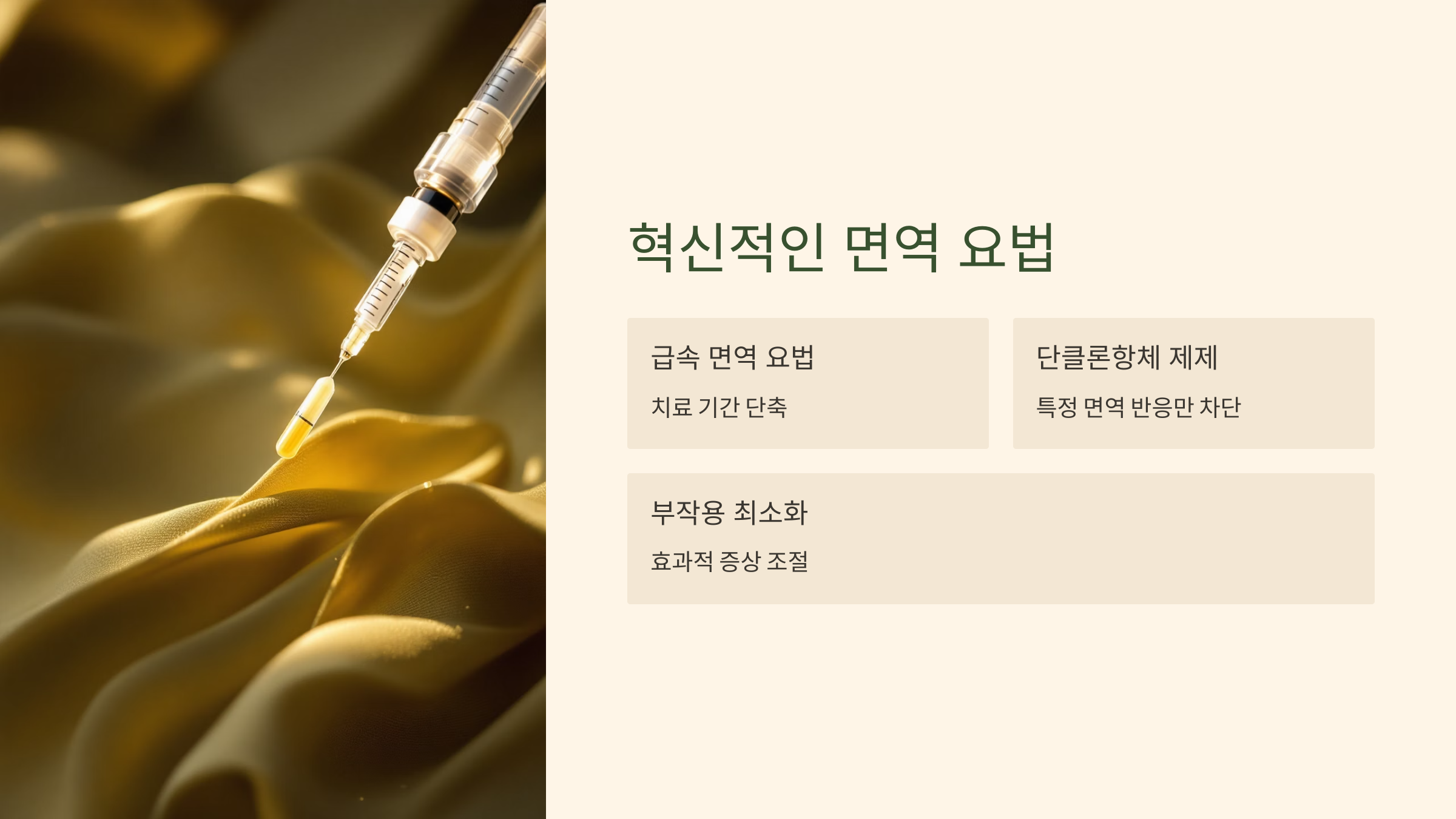 기존의 면역 요법은 장기간의 치료가 필요했지만, 최근에는 치료 기간을 단축시킬 수 있는 새로운 방법들이 개발되고 있습니다. 예를 들어, 고농도 알레르겐을 단기간에 투여하는 '급속 면역 요법'이 주목받고 있습니다. 또한, 단클론항체를 이용한 생물학적 제제가 도입되어 특정 면역 반응만을 차단하여 부작용을 최소화하면서 효과적으로 증상을 조절할 수 있습니다.
