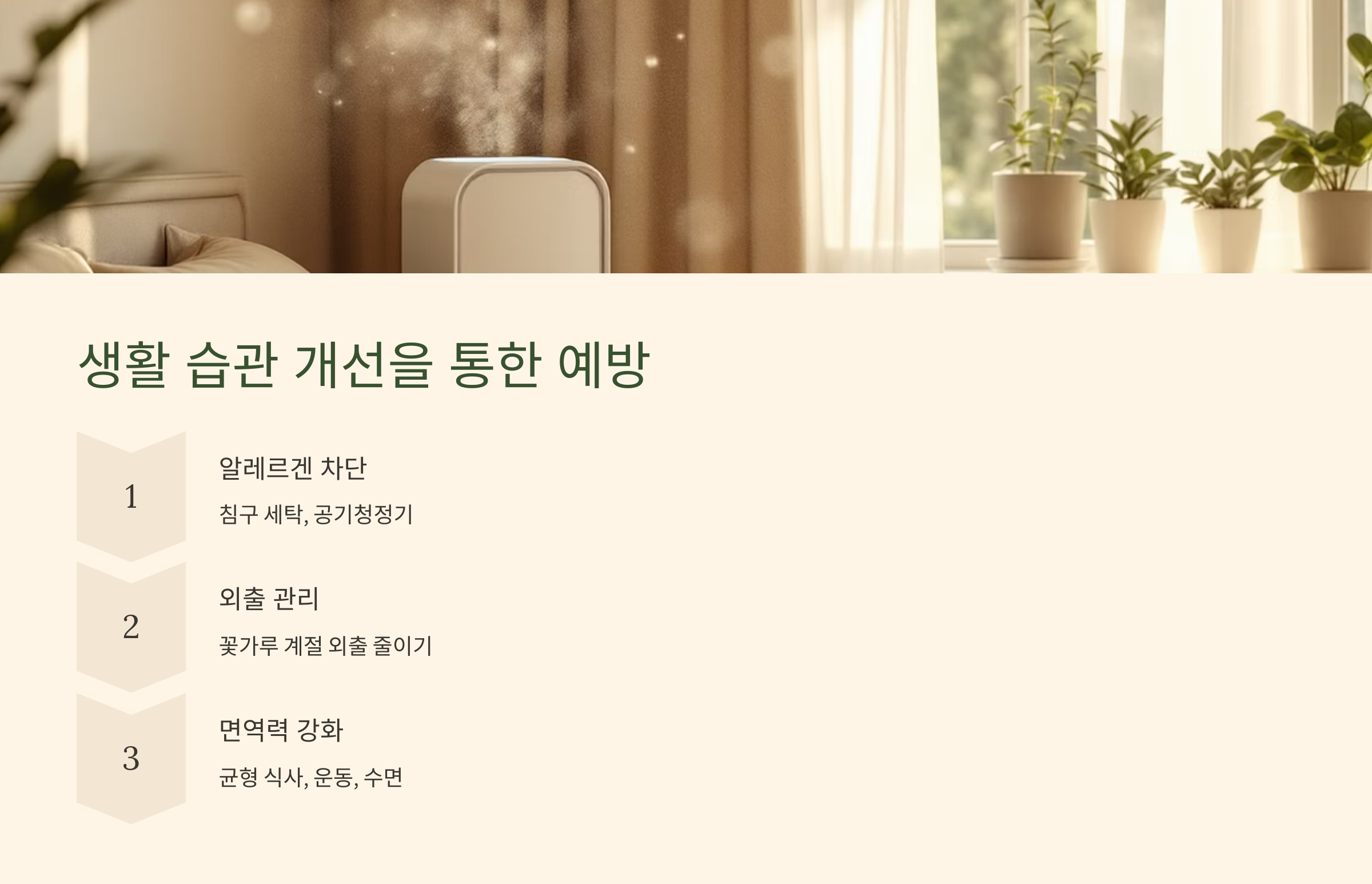 실내 공기 정화, 침구류 청결 유지, 균형 잡힌 식사, 규칙적인 운동, 충분한 수면 등이 비염 예방에 도움이 됩니다. 또한, 꽃가루가 많은 계절에는 외출을 줄이고, 외출 후에는 샤워를 통해 꽃가루를 제거하는 습관을 들이십시오.